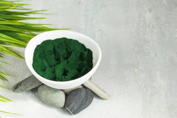 Prášok z chlorelly – mikroskopické riasy bohaté na živiny.